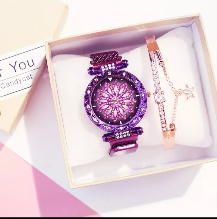 Women Mesh Magnet Buckle Lucky Flower Watches + bracelet set Luxury Ladies Rhinestone Quartz Watch Starry sky Relogio Feminino